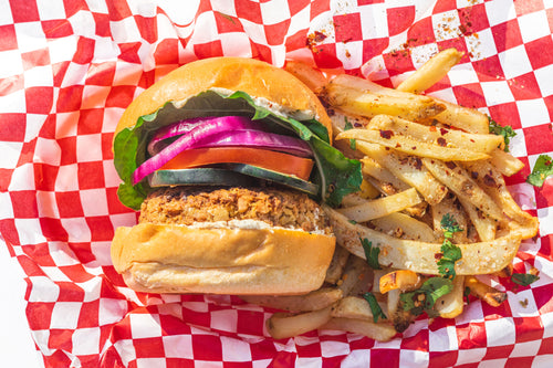 Plantbaed's signature falafel patty is a fusion of classic American burgers with a Mediterranean and alkaline twist! Grilled fresh, cripsy garbanzo patty wedged between vegan brioche buttery bun.